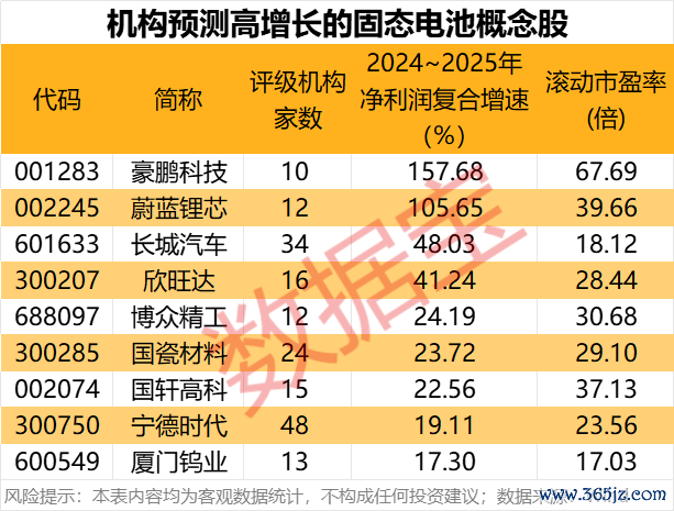 据数据宝统计,2024年前三季度净利润实现增长的固态电池概念股中,机构评级家数超10家且一致预测2024~2025年净利润复合增速超15%的个股有9只。